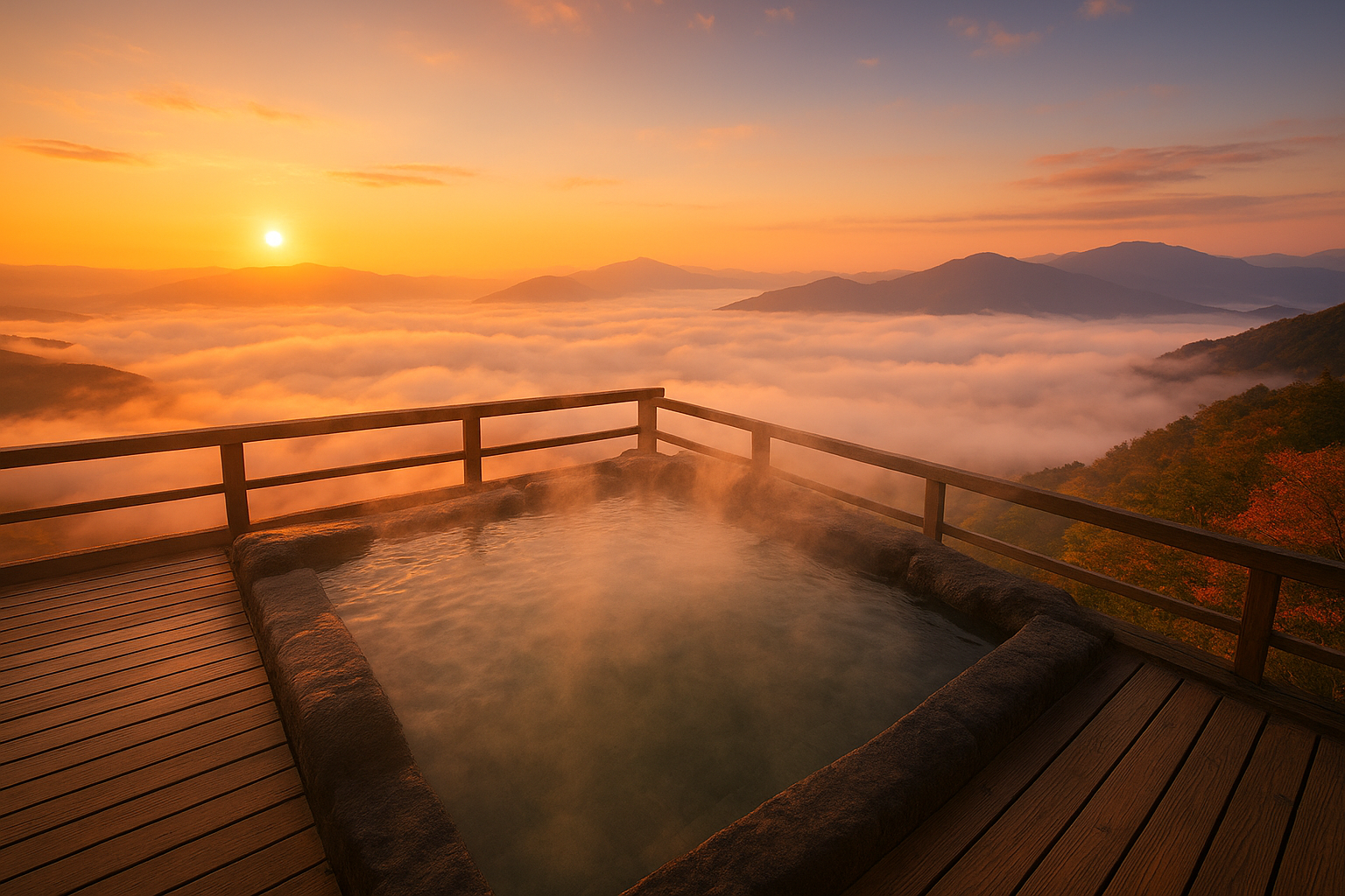 提案画像: 露天風呂の写真。湯気が立ち込め、遠くに山々が見える景色。
