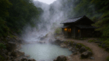 提案画像: 茅葺き屋根の宿と乳白色の露天風呂を囲むブナ林の風景