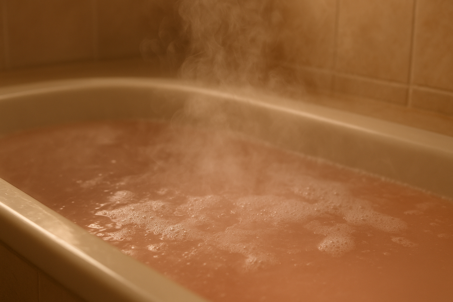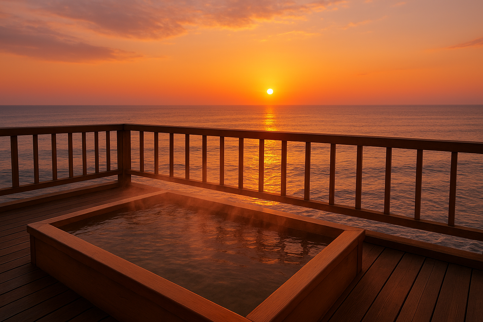 提案画像: 温泉旅館の露天風呂から見える夕焼けの風景。湯けむりが立ち込め、幻想的な雰囲気が伝わる。